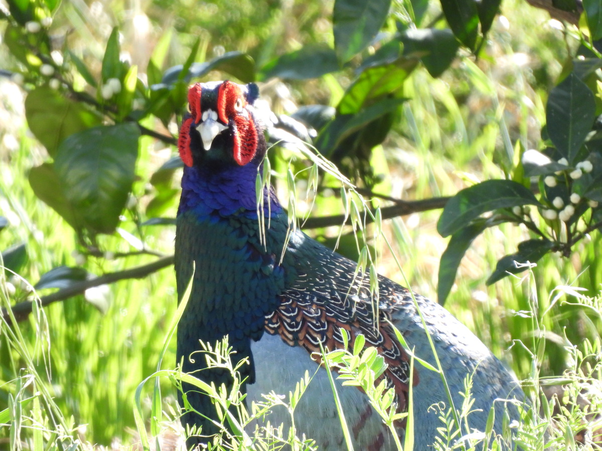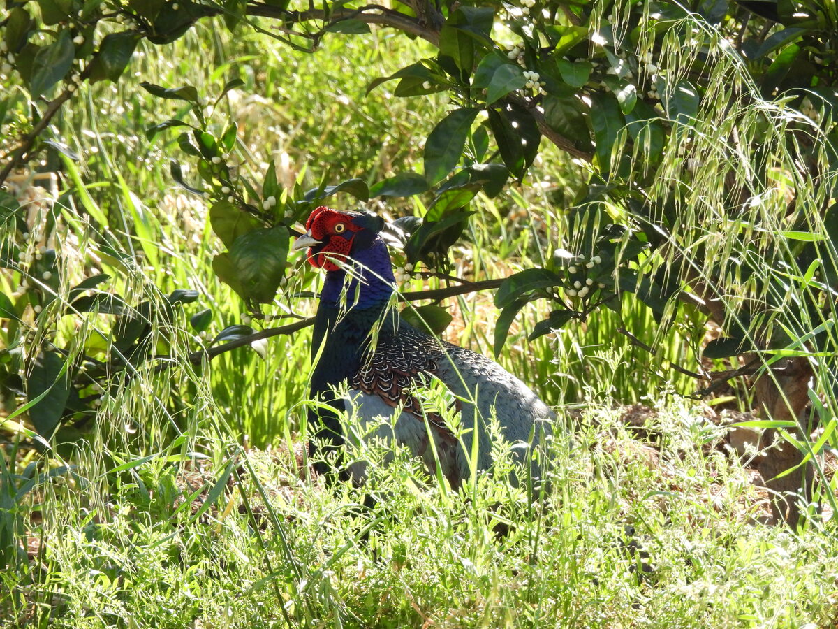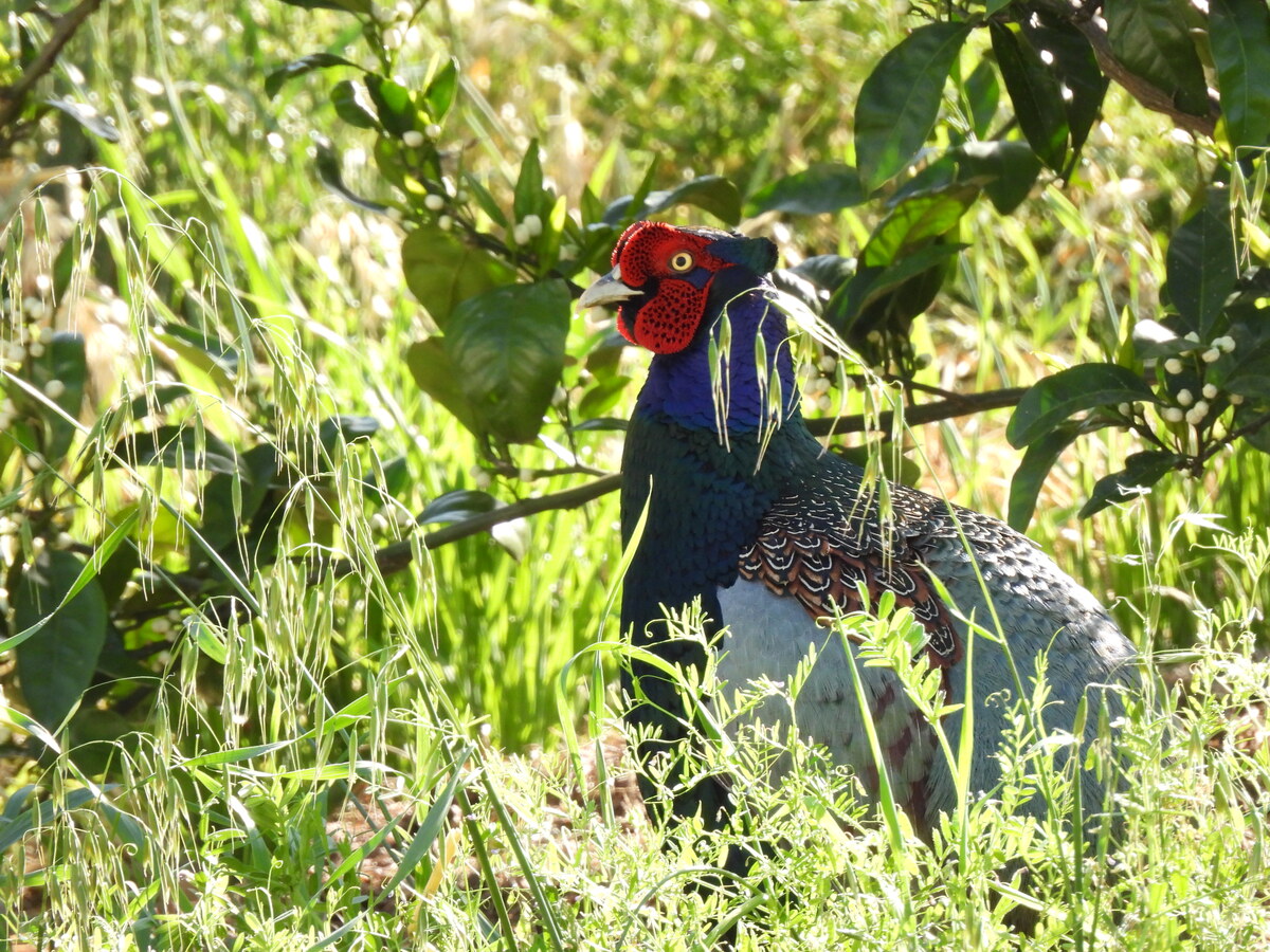 すると……いるじゃないですか!草むらの中に、堂々とたたずむ大きな鳥。 近づいてよく見てみると、顔の赤いほっぺた(肉垂)、青みがかった緑の胴体、茶色の模様が入ったキレイな羽……まぎれもなく野生のキジ(オス)です!