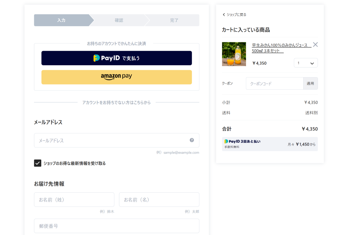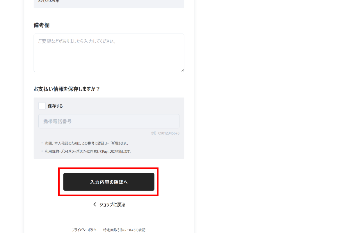 お届け先情報、お支払い情報、配送方法、などの必要情報を入力して「入力内容の確認画面へ」ボタンをクリックします。