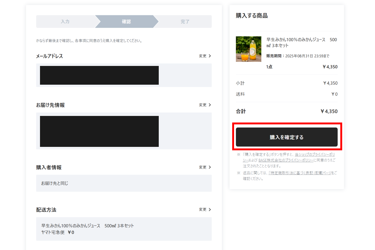 入力内容に間違いがなければ「購入を確定する」ボタンをクリックして、購入します。BASEよりご注文確認メールが届きましたらご注文完了です。